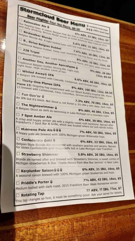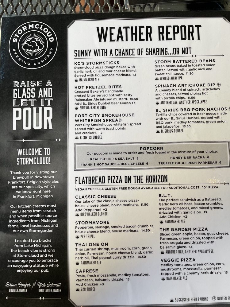 Welcome to Stormcloud Brewing Company, a charming gem nestled in Frankfort, MI. This American brewery marries delicious eats with craft beer, offering a menu that is both diverse and delectable. Dive into their Cheddar Ale Soup made with house-brewed Rainmaker Ale, or savor the housemade Chicken Salad topped with dried cherries on fresh greens. For sharing, the KC's Stormsticks and Storm Battered Beans come highly recommended, ensuring a delightful experience.